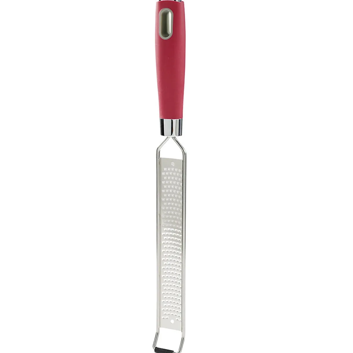 Râpe étroite en inox avec manche et poignée ergonomique en polypropylène rouge. Pratique pour râper des grains fins de fromage, de chocolat, des zestes d’agrumes ou hâcher finement toutes sortes de légumes et condiments.