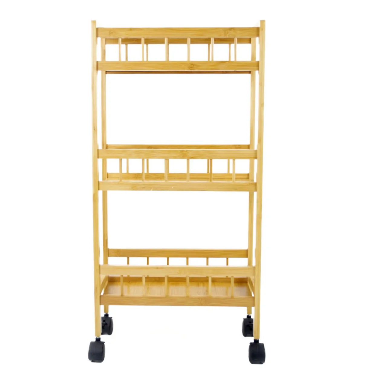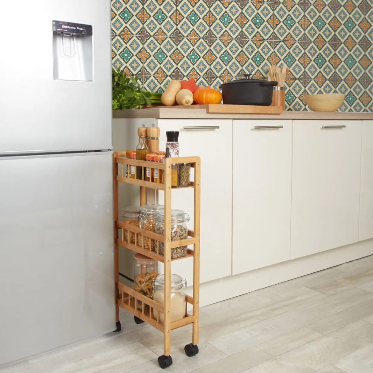 Pratique et discret, ce resserre à légumes en bambou et MDF (panneau de fibres de bois) naturel à trois niveaux vous permettra de ranger à portée de main légumes, fruits et épices. Équipé de quatre roulettes directionnelles dont deux avec frein, il est conçu pour se glisser facilement dans tous les recoins de la cuisine.