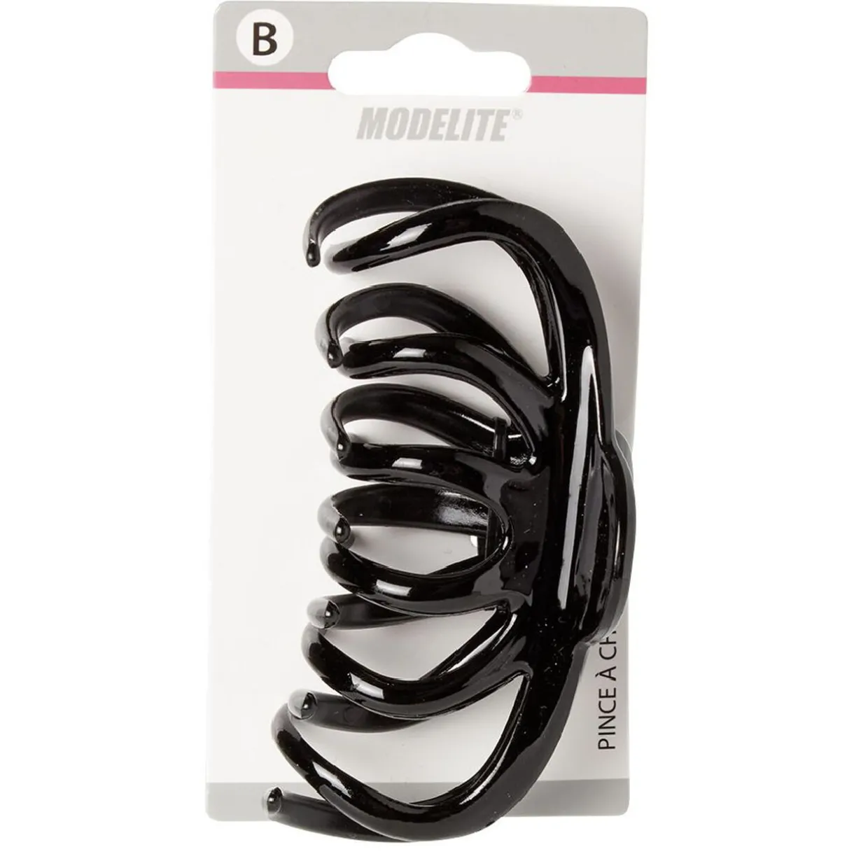 Pince à cheveux en plastique uni noir brillant. Longueur : 11 cm