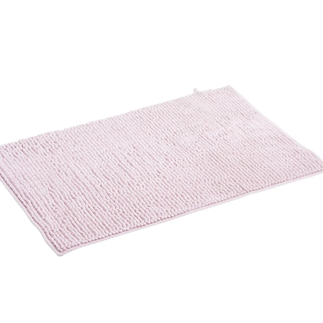 Tapis de salle de bain de type chenille au coloris rose. Agréable au toucher.