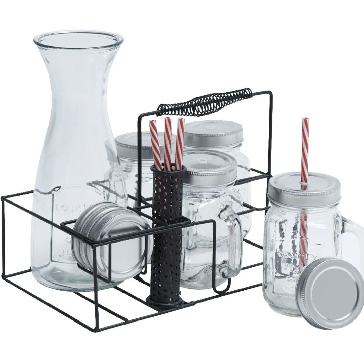 Support en métal dim. 17,5x30xh.19 cm, 4 bocaux en verre dim. Ø7xh.13 cm, 4 pailles L. 18,5 cm, 1 carafe en verre dim. Ø10xh.25,5 cm et 4 couvercles ø7 cm.