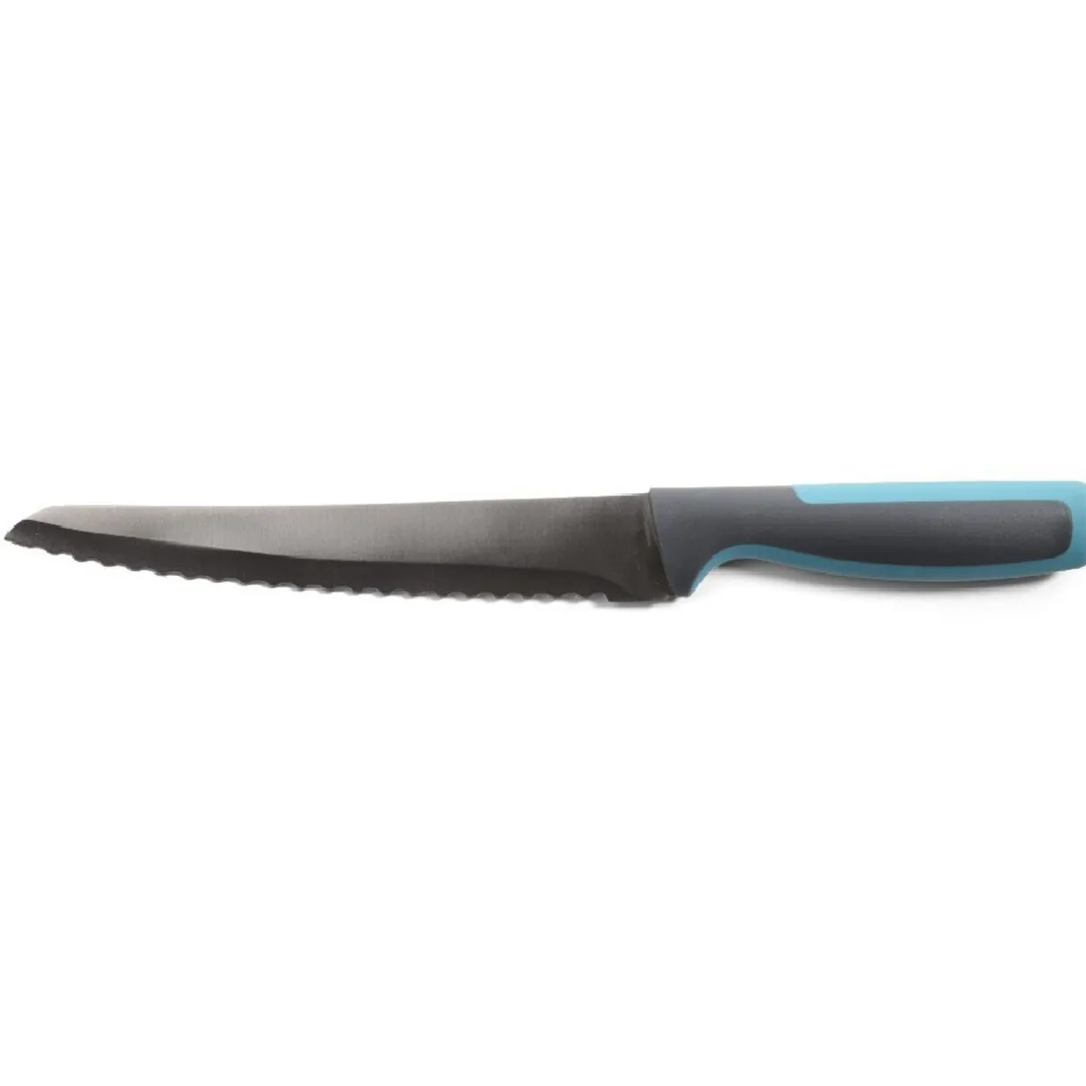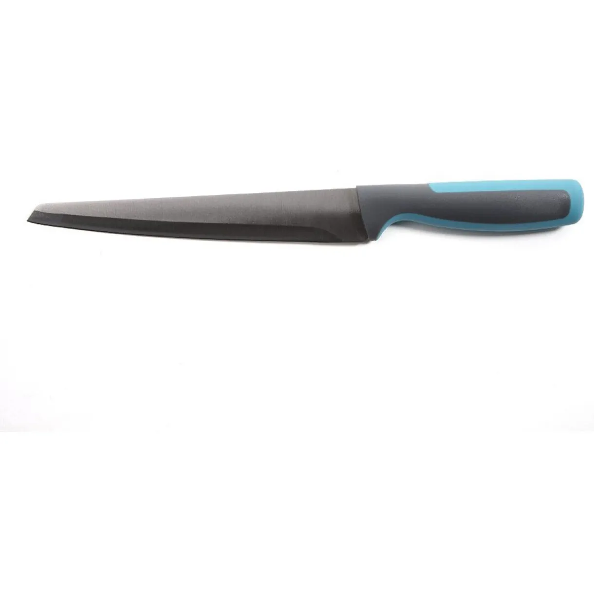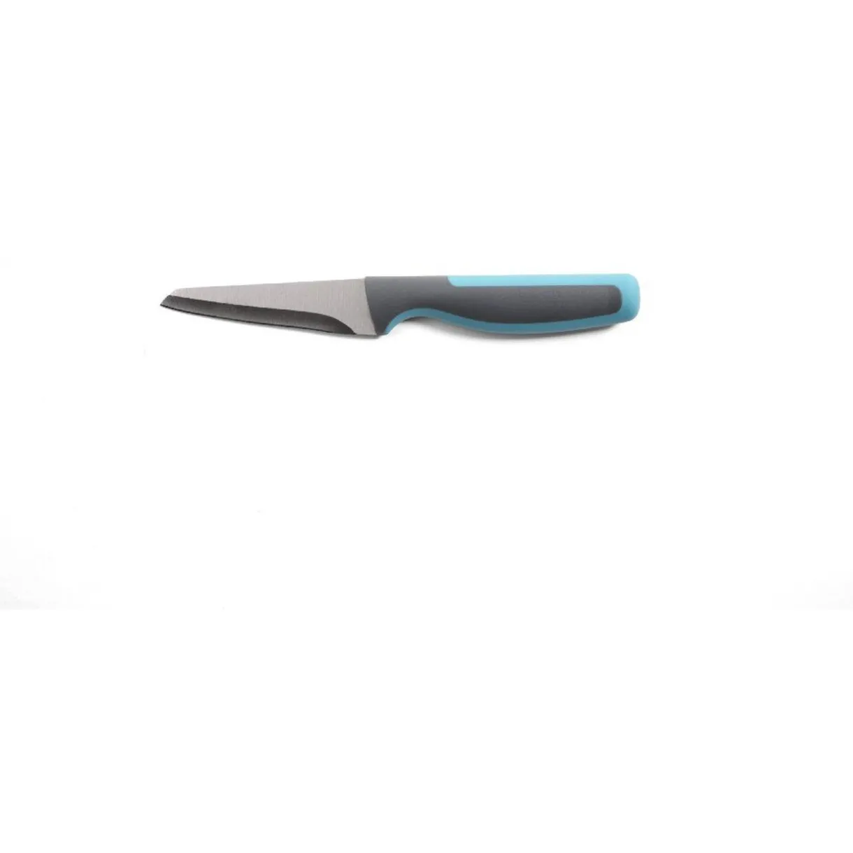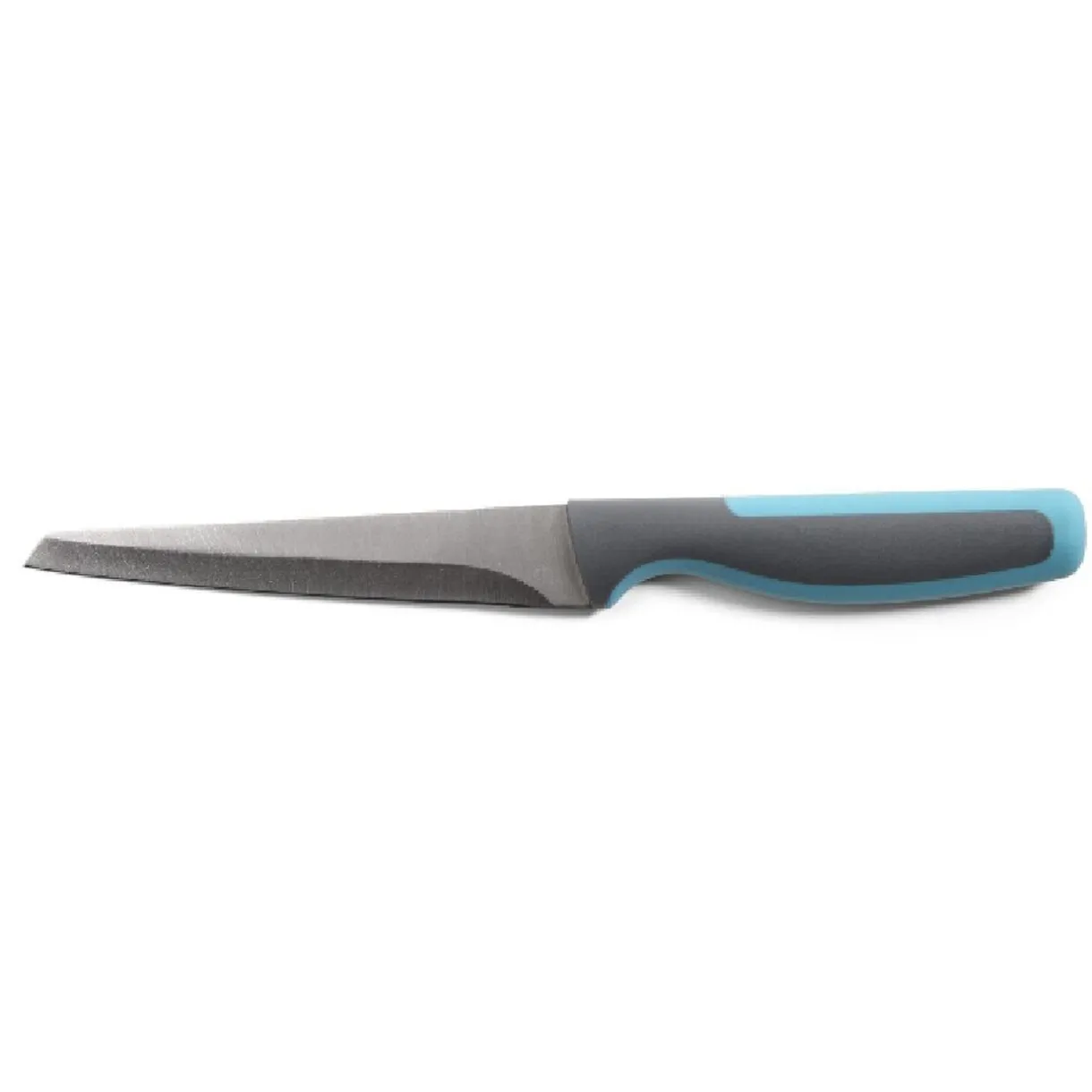 Set de couteaux 6 pièces comprenant : 1 couteau du chef L. 20 cm, 1 couteau à pain L. 20 cm, 1 couteau à trancher L. 20 cm, 1 couteau utilitaire L. 13 cm, 1 couteau à légumes L. 8 cm et 1 ciseau, inox et manche en plastique soft touch.