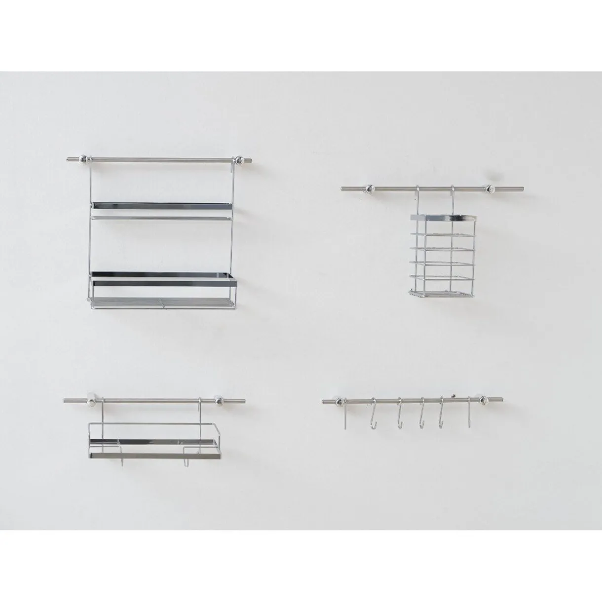 Set de rangement cuisine en inox 13 pièces : 1 dérouleur essuie-tout L. 27 cm, 1 pot à ustensiles dim. 11x11xh.17 cm, 1 étagère 2 niveaux dim. 18x30xh.31 cm, 6 crochets et 4 barres avec fixation L. 39 cm.