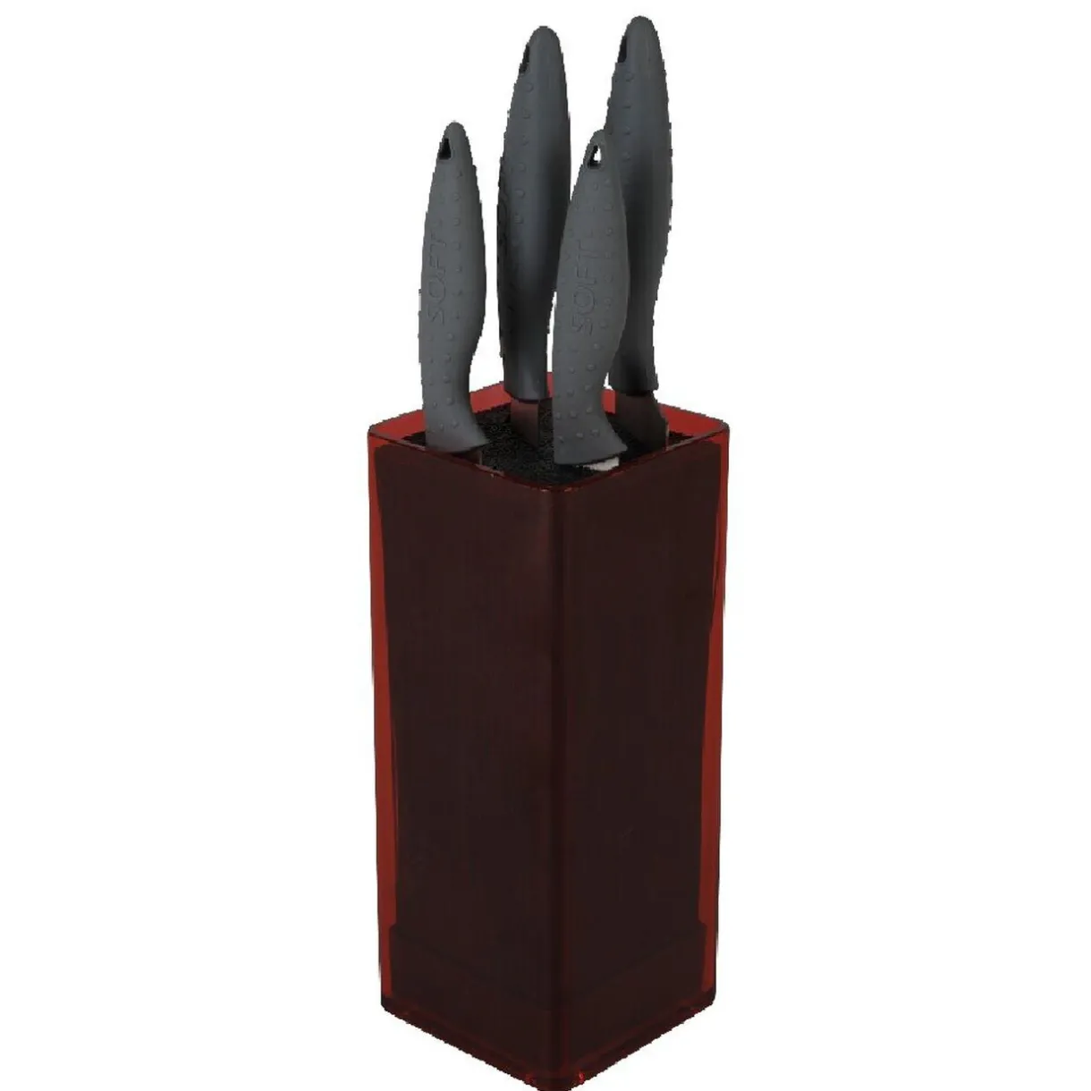5 couteaux en inox avec manche soft gris L. 20 cm, 13,5 cm et 9,5 cm. Support rouge et noir en acrylique adaptable à tous vos couteaux.