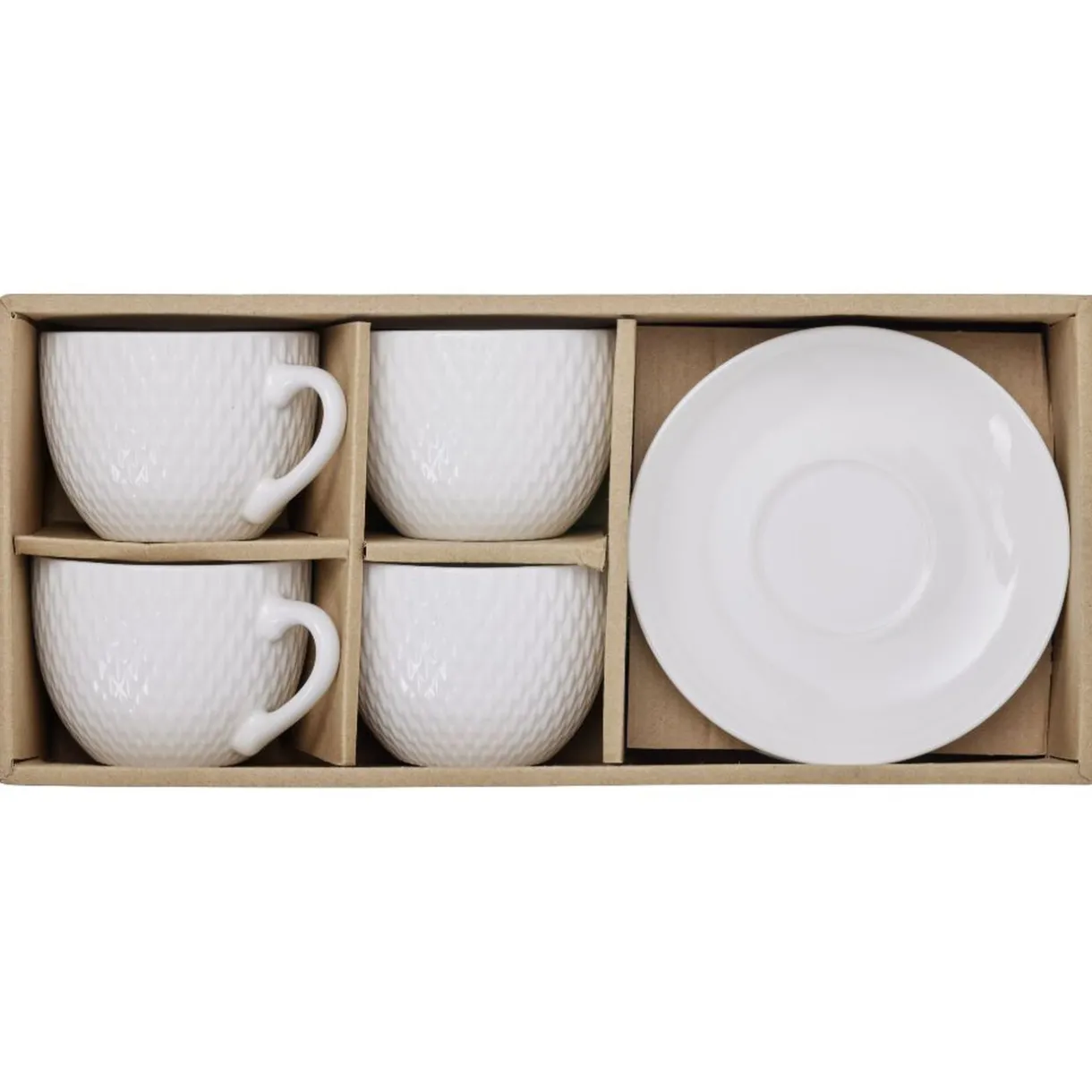 Service de 4 tasses blanches embossées avec ses sous-tasses lisses assorties, idéal pour boire le café !