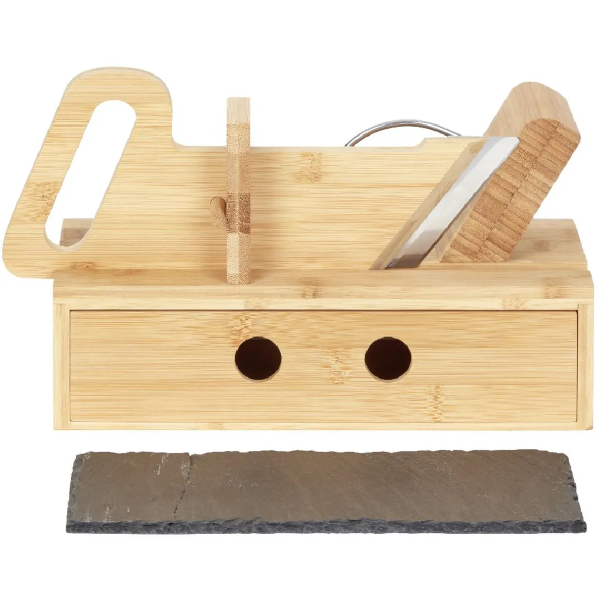 Cette trancheuse vous permet de stocker vos tranches dans son tiroir puis de les servir sur son plateau en ardoise.