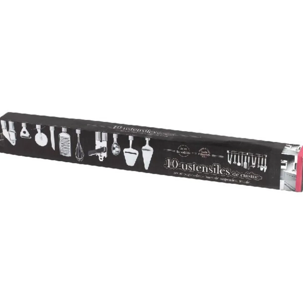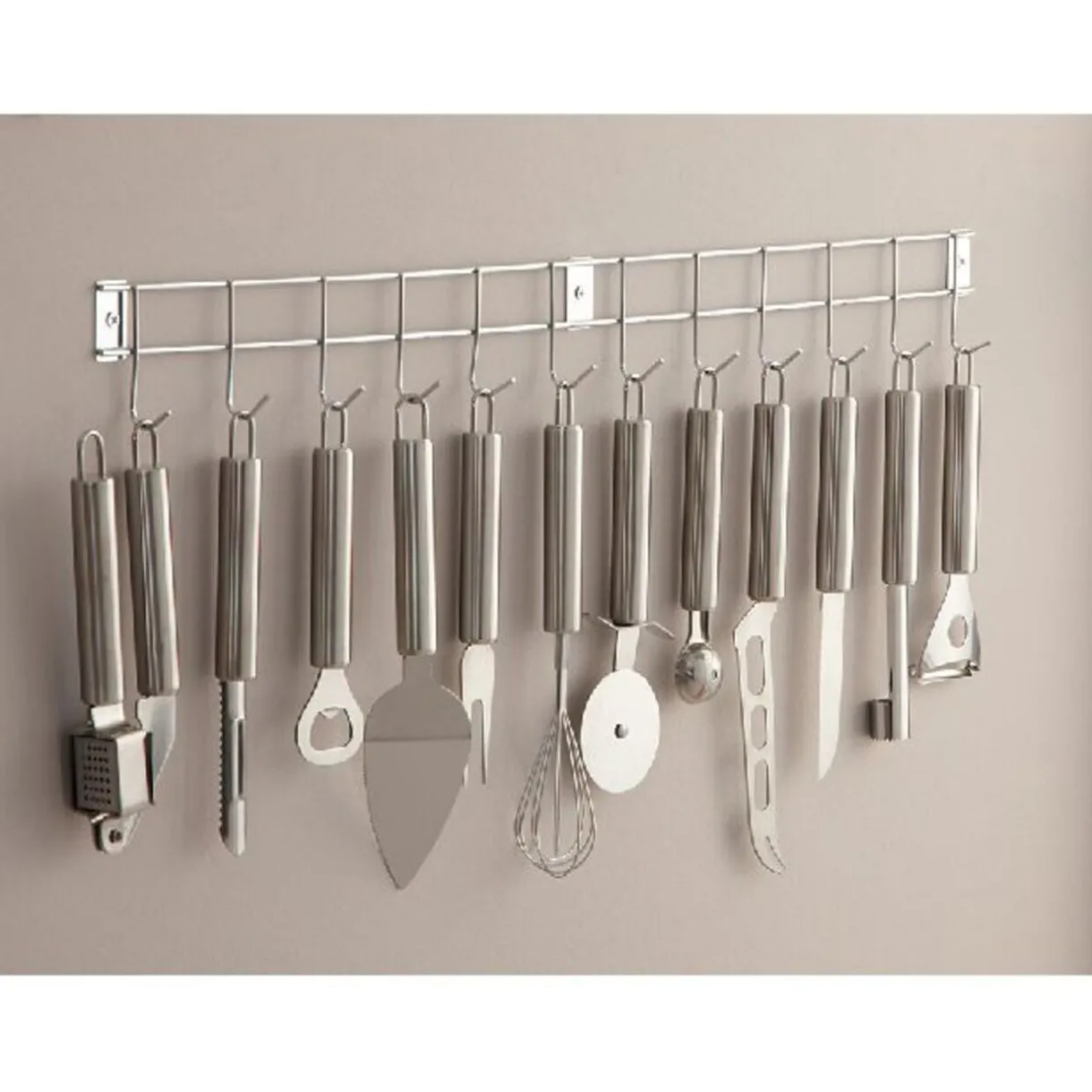 Support mural + 12 ustensiles en inox : 1 presse ail, 1 économe, 1 roulette, 1 couteau office, 1 râpe à fromage, 1 fouet, 1 ouvre-boîte, 1 cuillère à glace, 1 tranche-fromage, 1 pelle à tarte, 1 décapsuleur et 1 dénoyauteur. Fixations fournies.