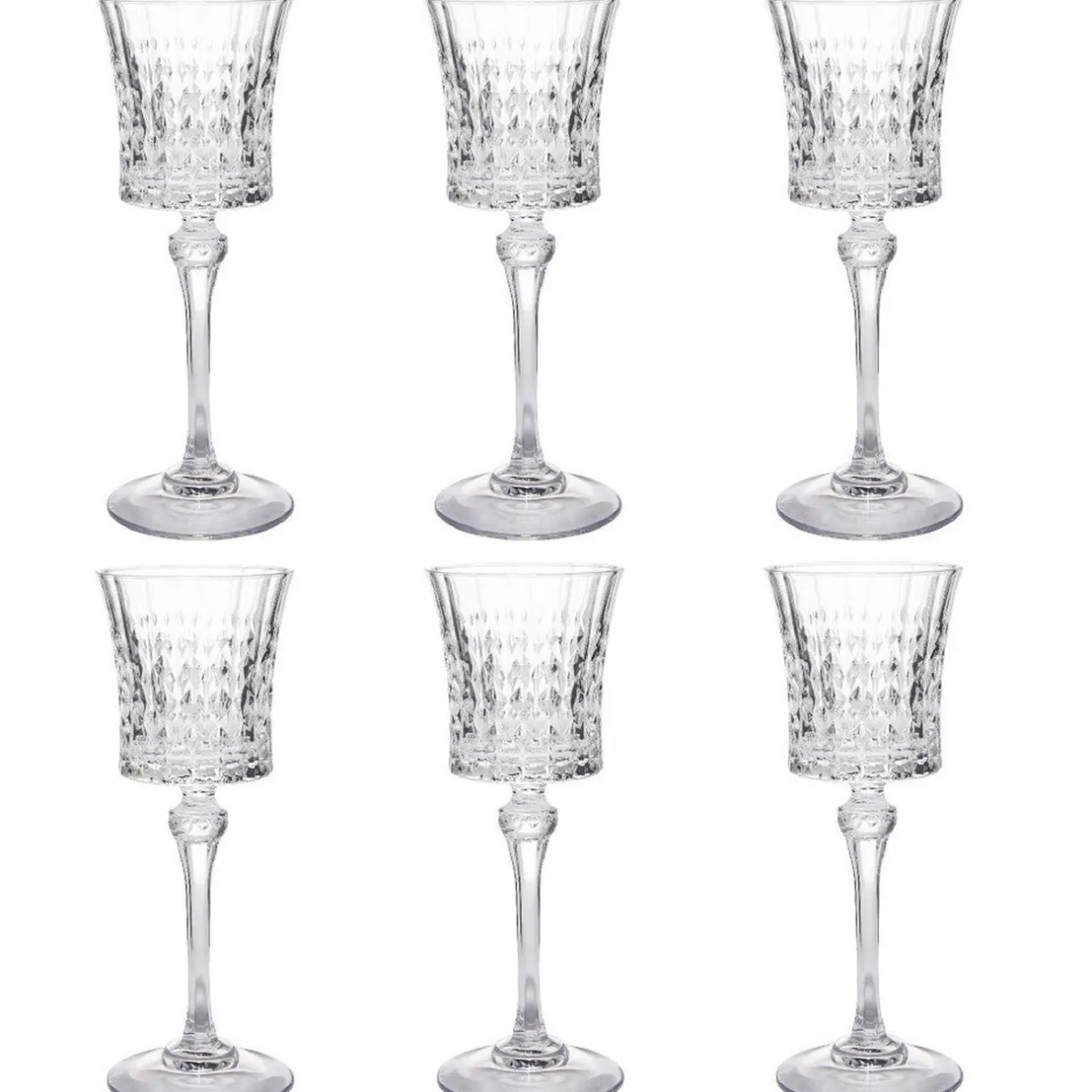 Lot de 6 verres à pied Lady Diamond d’une contenance de 19 cl. Idéal pour déguster votre vin préféré et apporter une touche chic à votre table grâce à son aspect diamanté transparent.