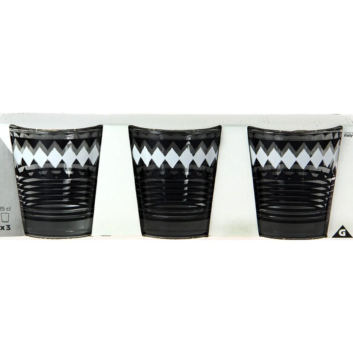 Lot de 3 verres bas en verre au motif graphique d’une contenance de 25 cl.